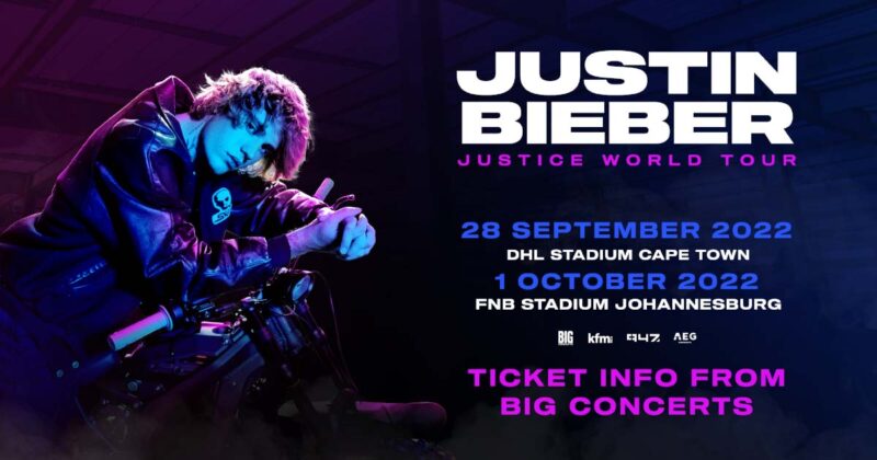 Justin Bieber today announced new dates for his much-anticipated Justice World Tour, including 28 September, DHL Stadium, Cape Town, South Africa and 1 October, FNB Stadium, Johannesburg, South Africa.