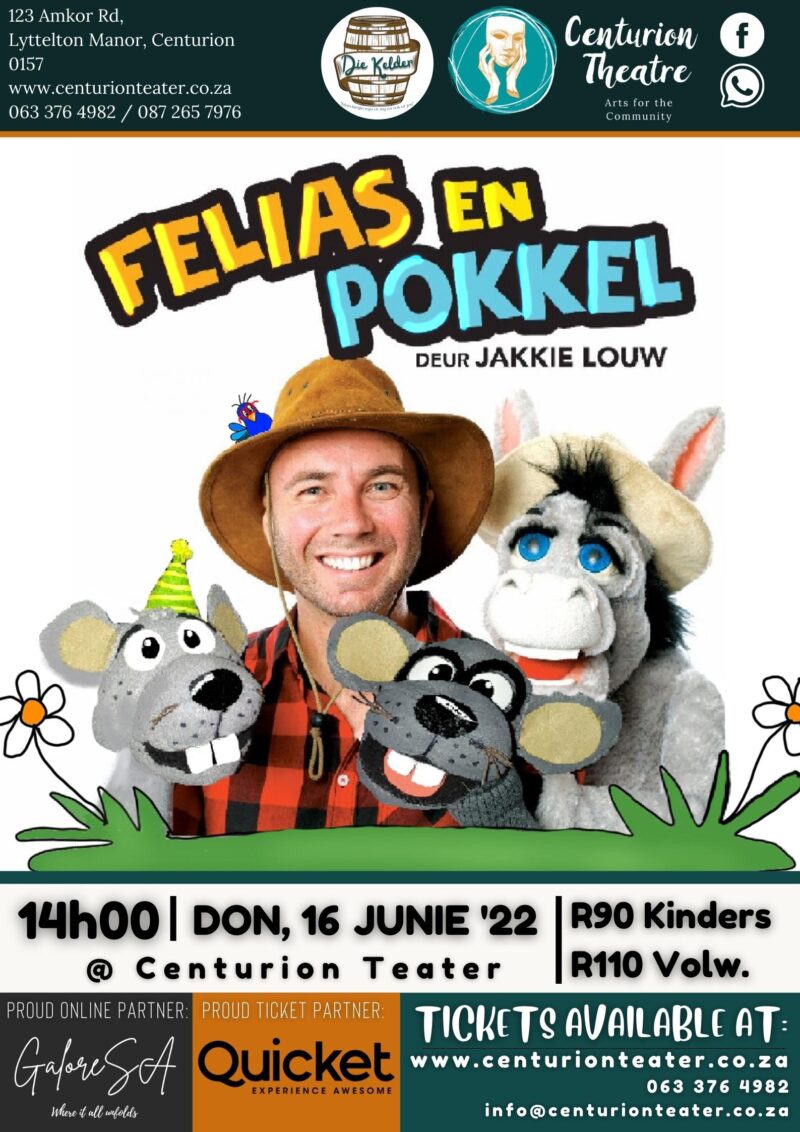 | VIR DIE KLEINSPAN – Jakkie Louw Amptelik bring die Felias en Pokkel Poppekas vertoning na die Centurion Teater! Almal, groot én klein, is welkom! Die storie handel oor twee veldmuise in boer Jakkie se huis. Felias is ’n slim, lang, maer muis met ’n brilletjie en Pokkel ’n kort, ronde, jong muis met ’n groen hoedjie op sy kop. Pokkel het baie vragies oor waar melk, koffie, plastiek en die suiker vandaan kom. Felias staan bont om te verduidelik en dan moet hulle ook nog die honger kat dophou! O ja, en daar is sowaar ’n pratende donkie ook! Jakkie Louw het alle musiek en die storie geskryf met liedjies soos “Die dae van die week” en “Moenie bang vir die kat wees nie.” |