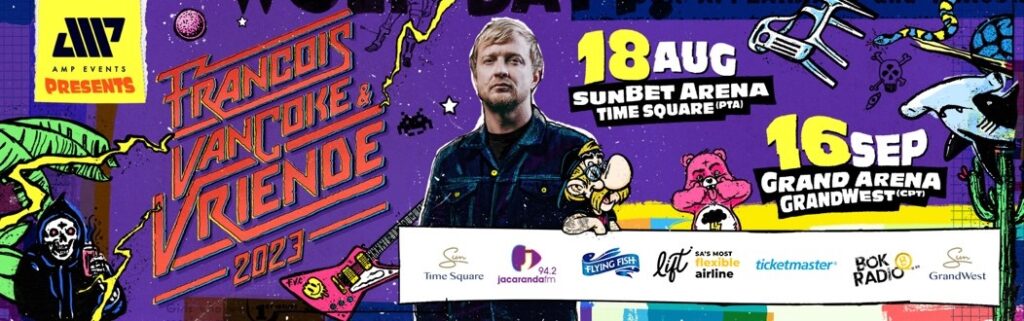 Francois van Coke & Vriende 2023 sien Pretoria by SunBet Arena op Vrydag, 18 Augustus en vir Kaapstad by Grand Arena, GrandWest op Saterdag, 16 September.