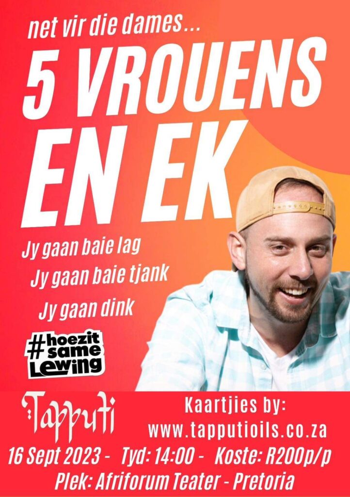 Bespreek nóú vir jou en jou vriendinne ’n tafel vir 5 VROUENS EN EK en kom geniet ’n heerlike middag saam. Enkele tafelbesprekings is hier beskikbaar: https://tapputioils.co.za/products/5-vrouens-en-ek-1