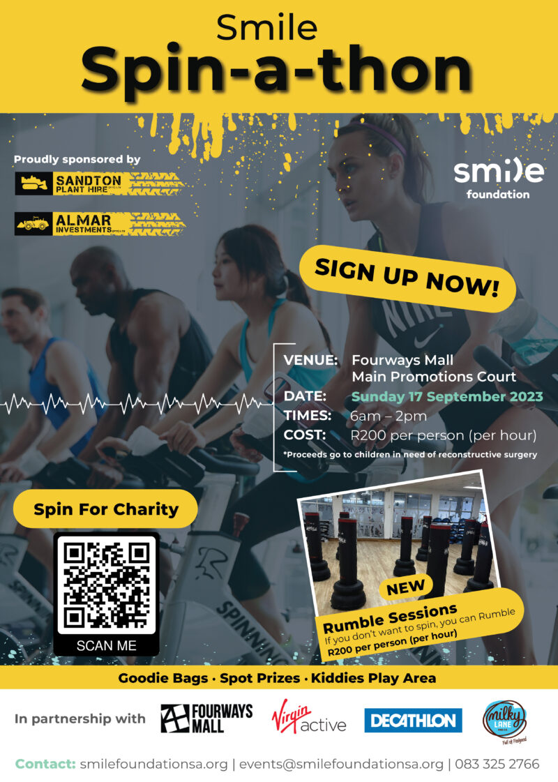 Join Smile Foundation on the 17th September at Fourways Mall for the Smile Spin-a-thon proudly sponsored by Sandton Plant Hire.