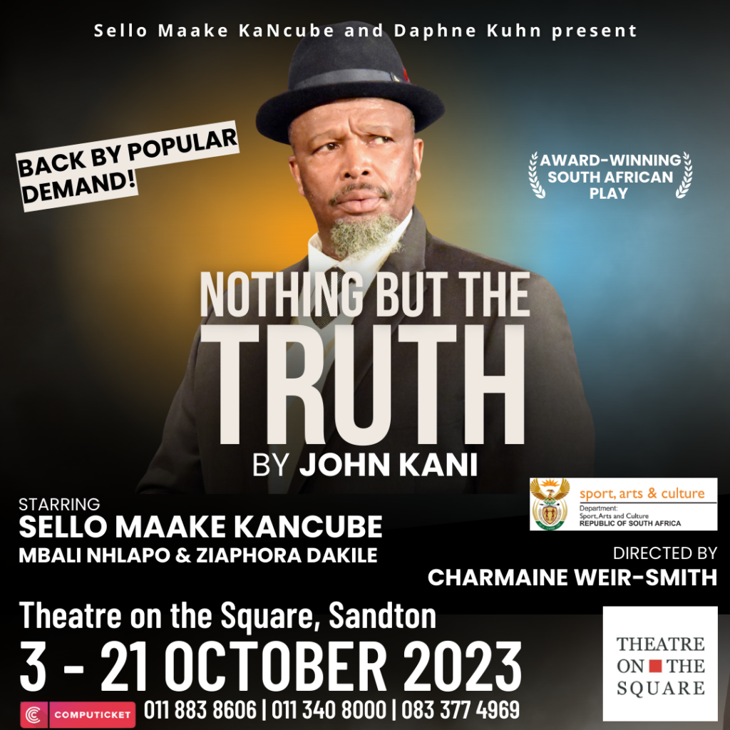 Following a triumphant sold-out season earlier this year, Theatre on the Square is thrilled to announce the return of the iconic South African play, NOTHING BUT THE TRUTH by John Kani. Presented with pride by Sello Maake KaNcube and Daphne Kuhn, this highly acclaimed production will grace the stage at Sandton’s Theatre on the Square for an unmissable three-week run, from 3rd – 21st October.