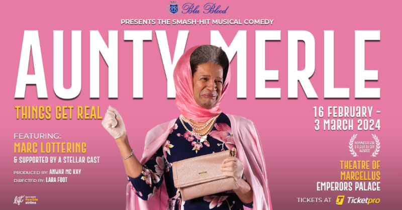 Aunty Merle Things Get Real is proudly brought to you by Blu Blood. The show runs from 16 February to 3 March 2024 at Theatre of Marcellus, Emperors Palace. Performances run at 20h00 on Fridays & Saturdays with matinees at 14h00 on Saturday & Sunday. Tickets from R220 are available through Ticketpro and Spar Payzone kiosks.