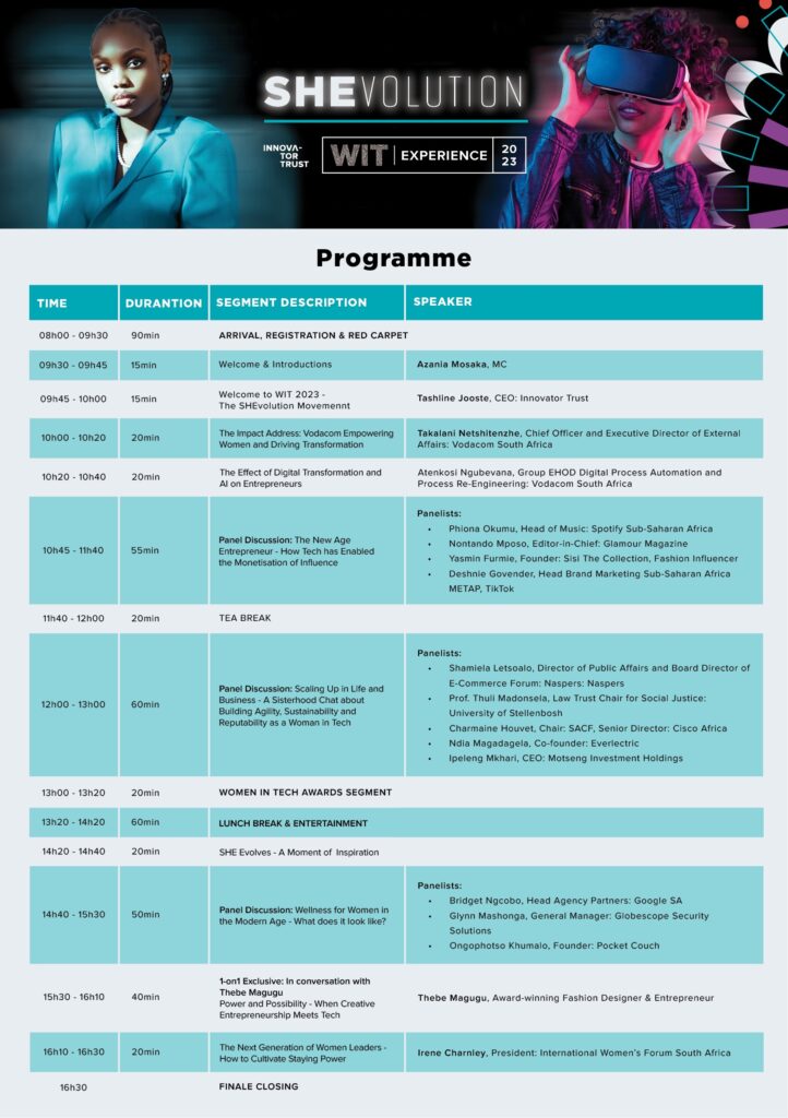 After expanding the reach of the WIT event beyond just a physical experience, this year’s event will mark the fourth hybrid showcasing of the Innovator Trust Women in Tech Experience, catering to both live physical and virtual audiences. With mobile technology access growing across Africa, the complimentary virtual experience has become an important focus to ensure as many women who need to hear the SHEVOLUTION message, can do so online, regardless of where in the world they may be based.