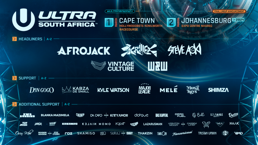 ULTRA South Africa, the continent’s premier electronic dance music festival, recently announced that global superstars Skrillex, Steve Aoki, Afrojack, W&W and Vintage Culture will be headlining the 2024 festival with Major League DJZ and Shimza as support acts. Now, with a month and a half to go before the main event, the festival continues to bring South African fans the best electronic music as the final line-up and stages are announced.