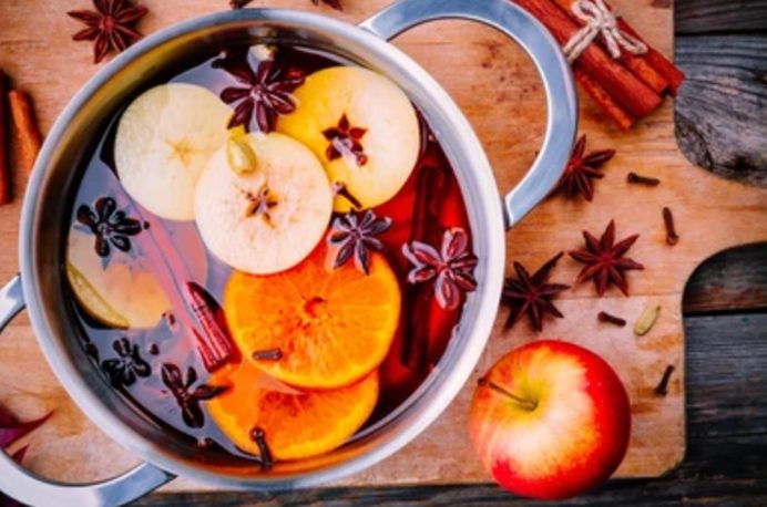 - In a large pot, combine the apple cider, Rooibos sachets, cinnamon stick, orange and apple slices, honey and cloves/star anise.