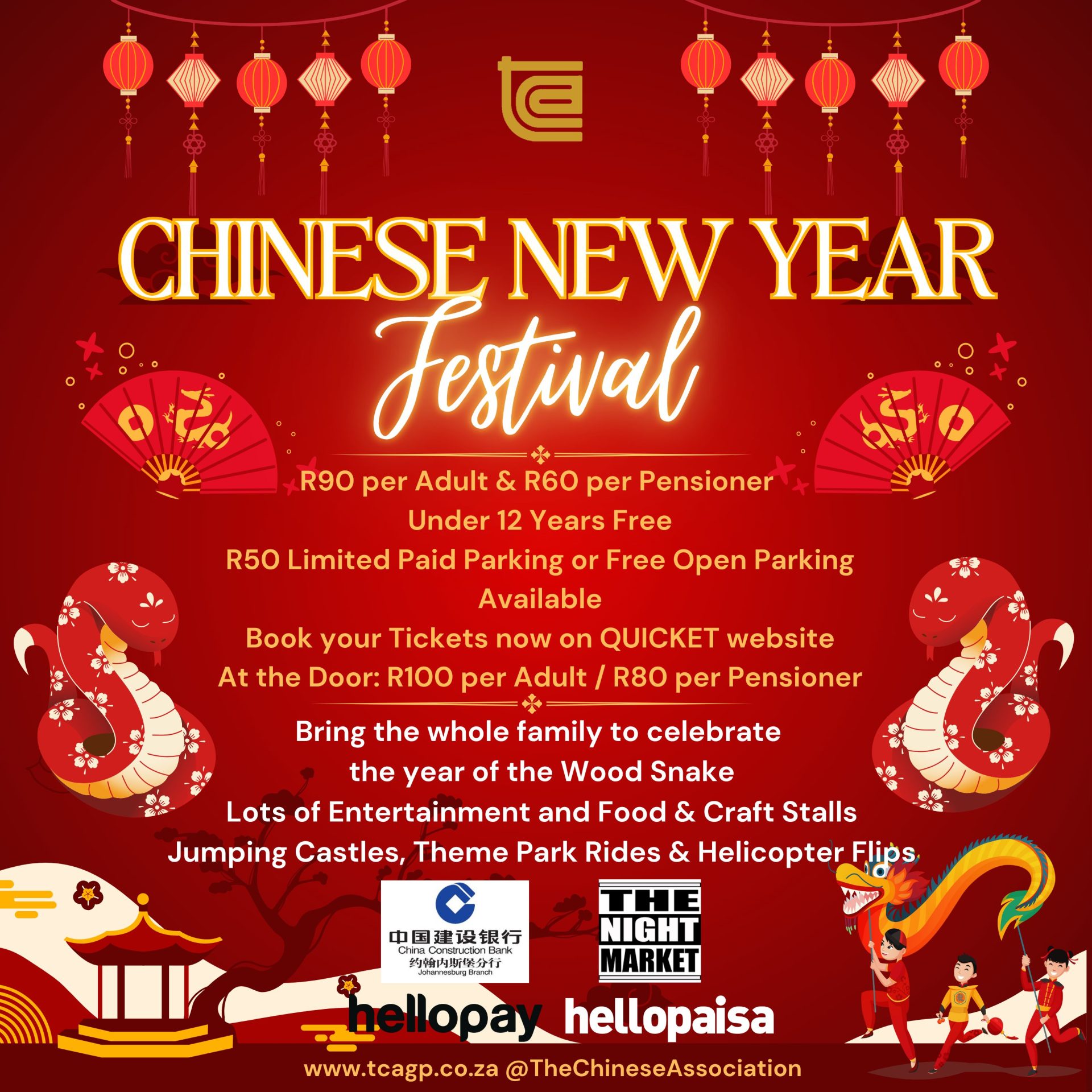 On Saturday 1st February 2025, The Chinese Association (TCA) will be hosting the annual Chinese New Year Festival celebrations at Alberton Rugby Club from 2pm till 9pm. To celebrate the Lunar New Year of the Wood Snake. Tickets available on QUICKET website.