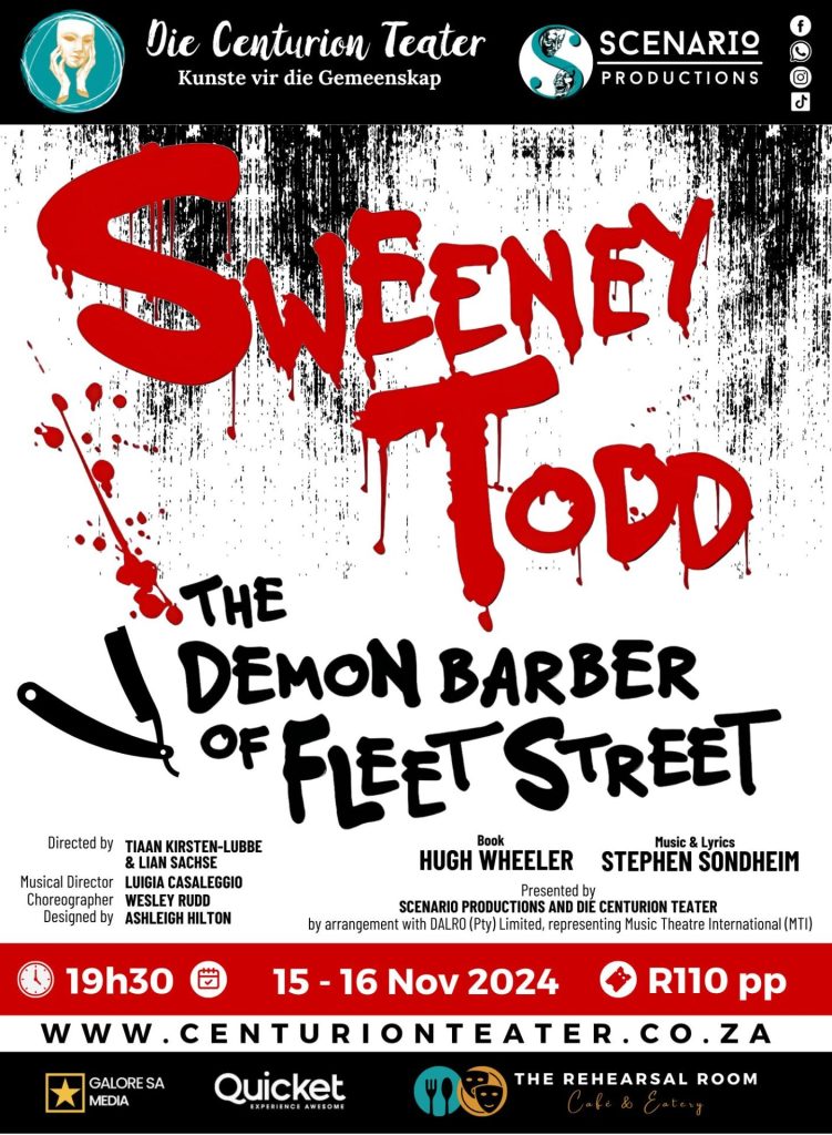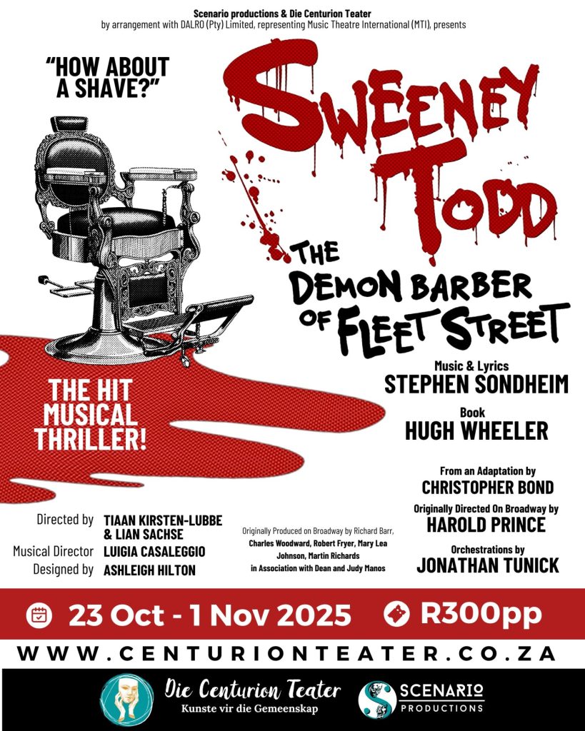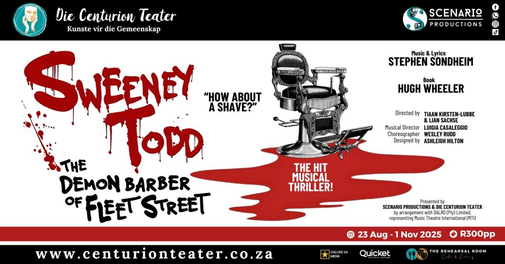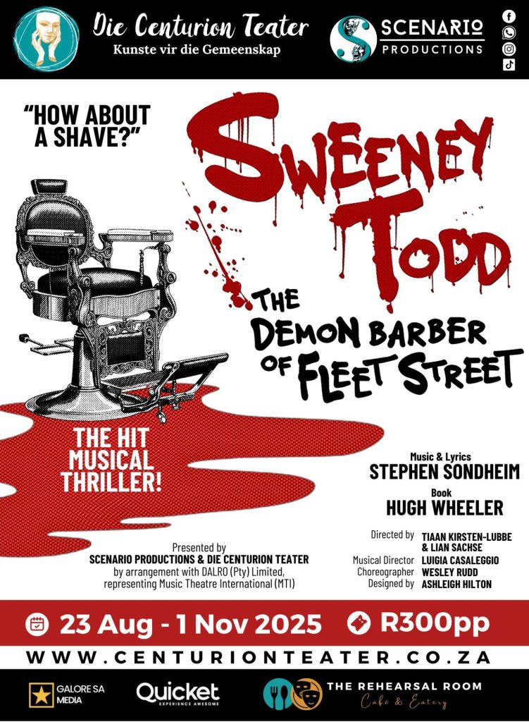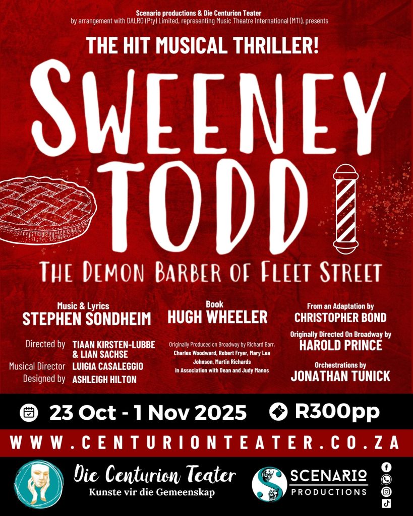 Scenario Productions, in proud partnership with Die Centurion Teater, is thrilled to announce the spine-tingling cast of Sweeney Todd – The Musical, the major theatrical event of 2025! From 23 October to 1 November, audiences will be plunged into the eerie underbelly of Victorian London in this immersive, blood-pumping production of Stephen Sondheim’s legendary masterpiece.