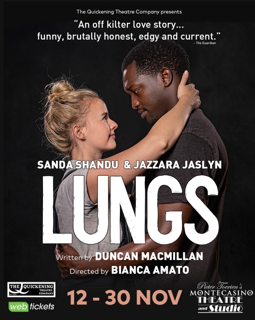 The Quickening theatre Company presents LUNGS, the West End hit by Duncan Macmillan, at the STUDIO Theatre, Montecasino in Johannesburg, after a successful and acclaimed run at Theatre On The Bay in Cape Town.