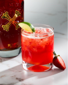 Fill a shaker with ice and add Bumbu Original, strawberry purée, and lime juice.