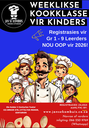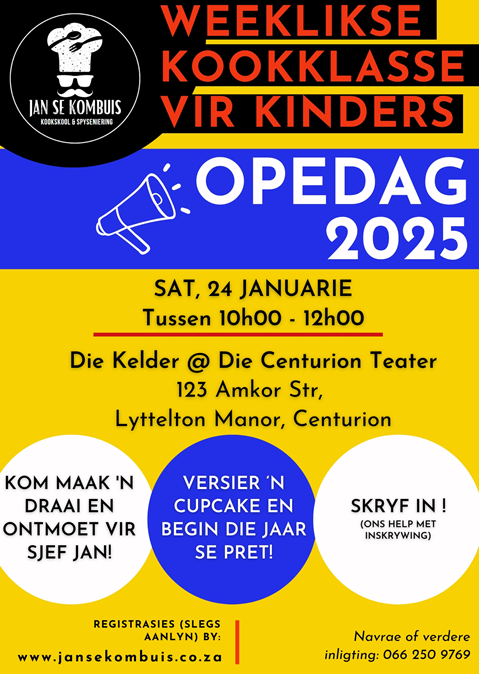 Kom kuier saam by ons Opedag op Saterdag, 24 Januarie 2026 van 10h00 – 12h00, en beleef ons kookskool eerstehands. Kinders kan ’n cupcake versier, ouers kan meer uitvind oor ons klasse en inskrywings vir 2026, en julle kry die geleentheid om Sjef Jan te ontmoet.